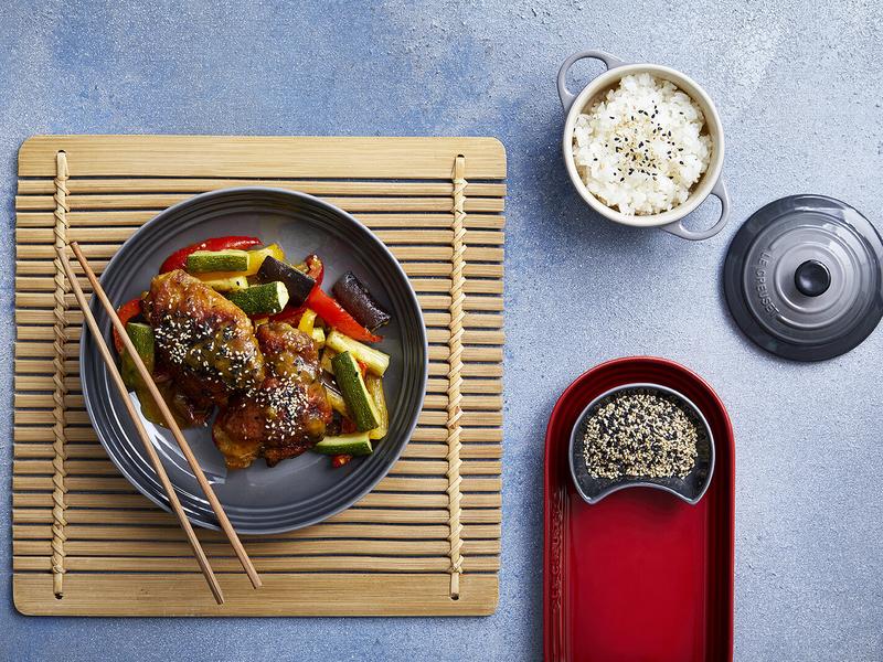 Die Hähnchenkeulen im vorgeheizten Backofen bei 175 C etwa 35 Minuten garen. 15 Minuten vor Ende der Garzeit die Süßkartoffeln mit in den Ofen geben. Sojasauce Zucker mittelscharfer Senf Tomatenketchup durchgepresste Knoblauchzehen Sesamöl Chiliflocken.